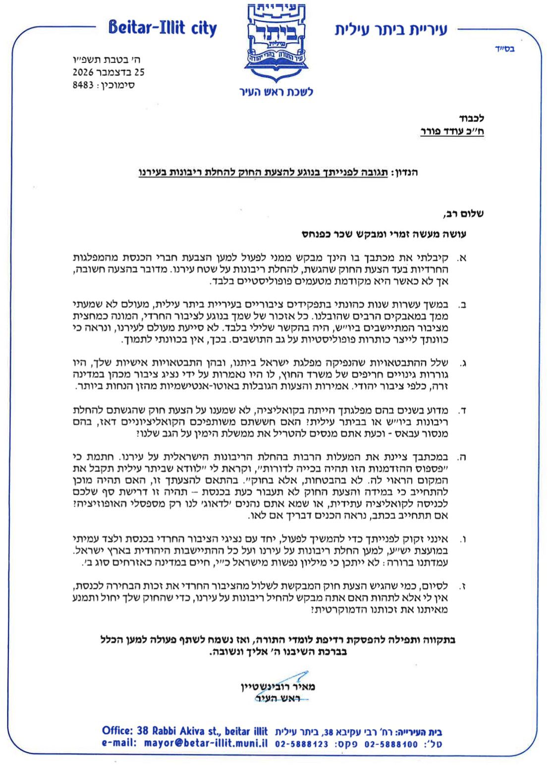 את מכתבו חתם במסר ערכי ברור: ריבונות – כן; שימוש ציני בעיר חרדית לצרכים פוליטיים – לא.