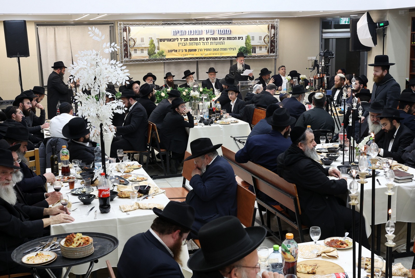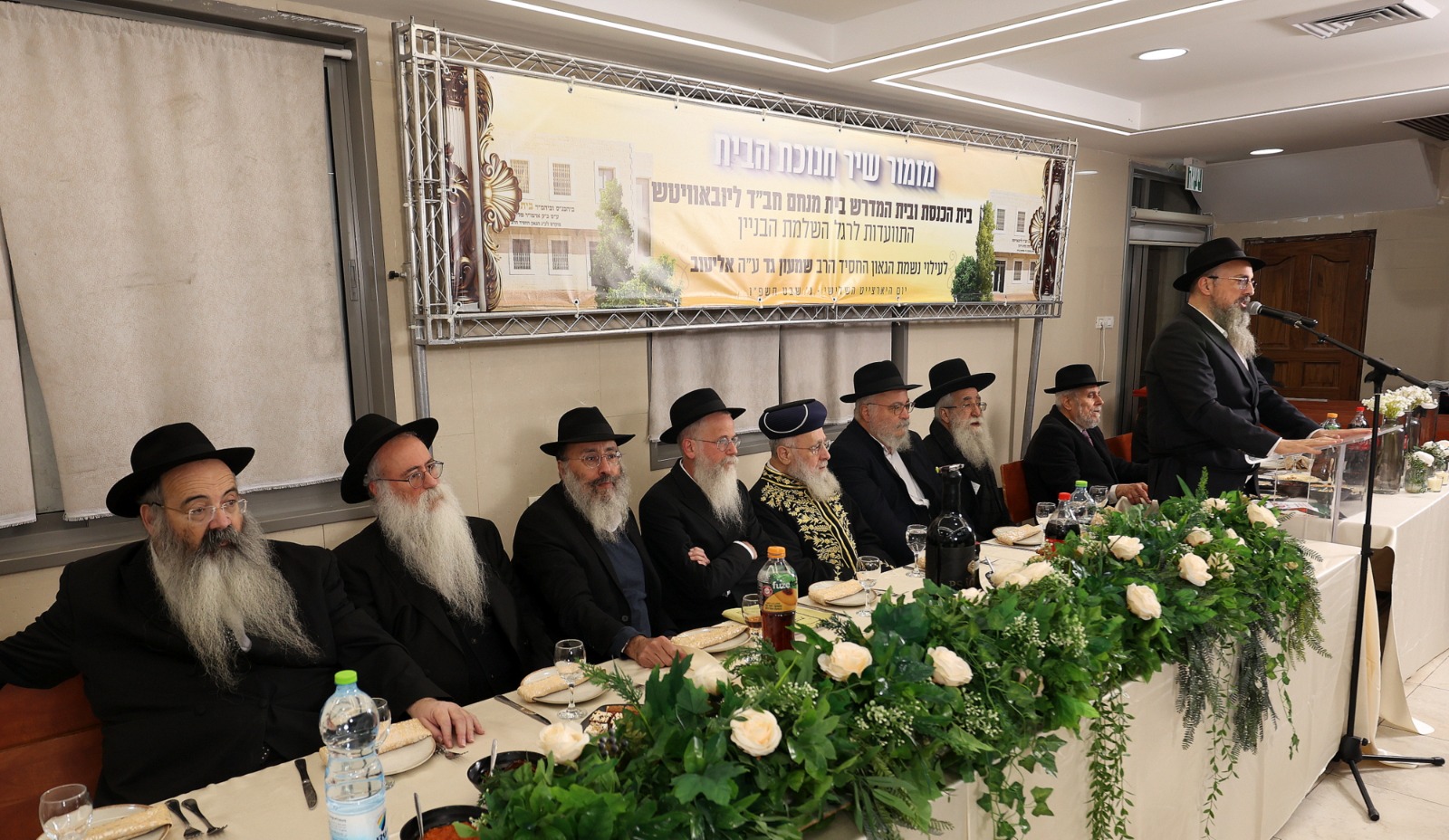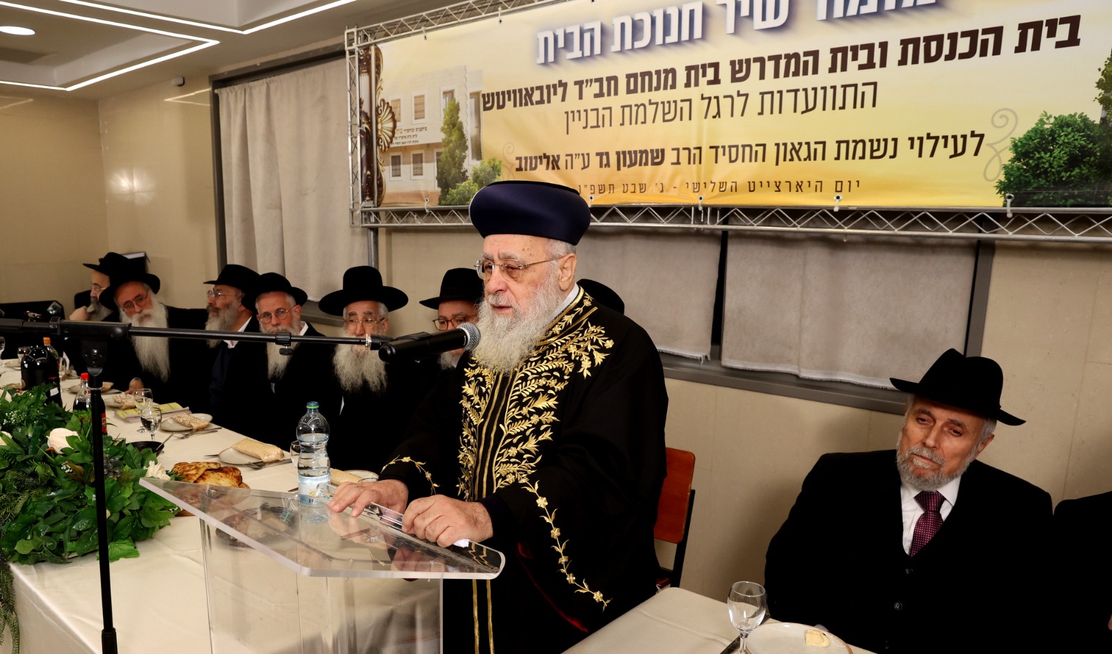 אורח הכבוד, הגאון הרב יצחק יוסף שליט”א, כובד בהסרת הלוט משלט בית הכנסת, עליו נחרטו המילים: ‘בית הכנסת ובית המדרש בית מנחם חב”ד ליובאוויטש, ע”ש כ”ק אדמו”ר מליובאוויטש נשיא דורנו, מוקדש לעילוי נשמת הגאון החסיד הרב שמעון גד אליטוב ע”ה”.